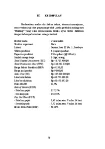 “Bulding” merupakan produk ini berfokus pada produksi puding susu sebagai kudapan, namun diinovasikan dengan penambahan Whey Protein Isolate (WPI) untuk menciptakan makanan fungsional tinggi protein. Puding susu dipilih karena daya tariknya yang tinggi di berbagai kalangan di Indonesia dan dapat mendukung tren gaya hidup sehat. Tujuan penulisan makalah ini adalah melakukan perencanaan unit usaha puding susu “Bulding” yang dirancang memiliki kapasitas produksi harian direncanakan sebesar 150 cup (@100 mL) per hari, dengan total produksi tahunan 45.000 cup. Bahan yang digunakan berupa air, susu UHT, bubuk whey, gula pasir, krimer kental manis, tepung agar-agar instan. Proses pengolahan dilakukan melalui tahapan pencampuran I,pemanasan, pencampuran II, pendinginan, dan pengemasan dalam cup plastik thinwall 100 mL. Lokasi terletak di Jl. Sarono Jiwo III No. 5, Surabaya. Produk dipasarkan dengan harga Rp 9.000,00 per cup. Usaha “Bulding” memiliki total modal industri (TCI) sebesar Rp 43.717.400,00 dan total modal produksi (TPC) sebesar Rp 336.202.320,00/tahun, dan memiliki Harga Pokok Produksi (HPP) sebesar Rp 6.583,00 per cup. Dengan total penjualan tahunan Rp 405.000.000,00, usaha ini diperkirakan menghasilkan laba kotor tahunan Rp68.797.680,00 dan setelah dikurangi pajak penghasilan 0,5%, laba bersihnya mencapai Rp 68.453.692,00. Laju pengembalian modal (ROR) setelah pajak 156,58% (lebih besar dari nilai MARR 12,5%), waktu pengembalian modal (POT) setelah pajak 7 bulan 16 hari dan titik impas (BEP) sebesar 46,70%. Berdasarkan analisa kelayakan dari faktor teknis dan ekonomi usaha “Bulding” layak untuk didirikan.