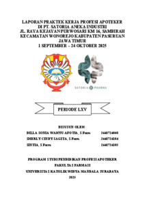 Sagita, Sherly Cindy, Sintia, Sintia and Afotia, Dilla Sonia Wahyu (2025) Laporan Praktik Kerja Profesi Apoteker di PT. Satoria Aneka Industri Jl. Raya Kejayan Purwosari KM 16, Sambirah Kecamatan Wonorejo Kabupaten Pasuruan Jawa Timur 1 September - 24 Oktober 2025. Project Report (PKL, PKIPP, Magang D3, Praktik Kerja Profesi Apoteker, Profesi Guru, Profesi Ners dan Profesi Insiyur). Faculty of Pharmacy, Surabaya, Indonesia. (Submitted)
