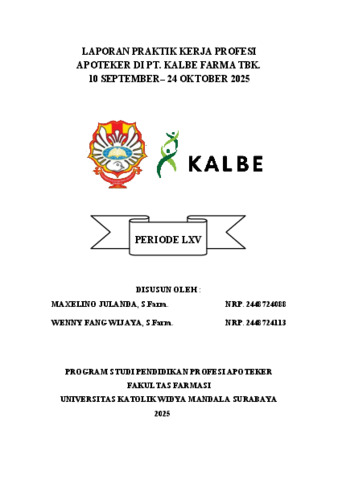 Wijaya, Wenny Fang and Julanda, Maxelino (2026) Laporan Praktik Kerja Profesi Apoteker di PT. Kalbe Farma Tbk. 10 September– 24 Oktober 2025. Undergraduate thesis, Widya Mandala Surabaya Catholic University.