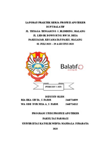 Sinta, Ria Eka and Amalia, Wa Ode Nur Nisa (2026) Laporan Praktek Kerja Profesi Apoteker di PT Balatif Jl. Tenaga Tengah No. 5, Blimbing, Malang Jl. Ledok Dowo Rt 01 Rw 10, Desa Pakisjajar, Kecamatan Pakis, Malang 01 Juli 2025 – 29 Agustus 2025. Project Report (PKL, PKIPP, Magang D3, Praktik Kerja Profesi Apoteker, Profesi Guru, Profesi Ners dan Profesi Insiyur). Faculty of Pharmacy, Surabaya, Indonesia. (Submitted)