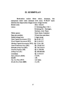 Minuman probiotik berbasis fermentasi saat ini semakin diminati oleh masyarakat seiring meningkatnya kesadaran akan pentingnya kesehatan. Salah satu produk fermentasi yang berkembang adalah kefir. Kandungan gula alami yang tinggi dan rasa segar pada nanas madu menjadikannya bahan baku lokal potensial untuk fermentasi fruit kefir yang disukai konsumen. Produk ini diberi nama “K’ELIX”. Unit usaha “K’ELIX” dirancang dengan kapasitas produksi 50 botol dan pouch per hari (@200 mL). Bentuk usaha yang dipilih adalah home industry dengan struktur organisasi lini yang dijalankan oleh 3 orang tenaga kerja, dengan waktu kerja 5 hari/minggu (8 jam/hari). Lokasi usaha direncanakan berada di Sentra Wisata Kuliner Ketintang, Surabaya, dengan target pasar remaja hingga dewasa muda. Usaha “K’ELIX” memerlukan total modal industri (TCI) sebesar Rp 48.685.215/bulan, dengan sumber modal utama berasal dari pemilik dan total biaya produksi (TPC) sebesar Rp 278.065.945. Laju pengembalian modal (ROR) setelah pajak sebesar 45,05 % yang lebih besar dari Minimum Attractive Rate of Return (MARR) 12%; waktu pengembalian modal (POT) setelah pajak 1,82 tahun dan titik impas (BEP) sebesar 60,84%. Berdasarkan uraian analisis teknis dan ekonomis di atas, maka usaha “K’ELIX” layak untuk didirikan.