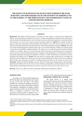 Dinata, Oey Olyvia, Sincihu, Yudhiakuari and Putri, Maria Patricia Dian (2025) The effect of bath soap use, bath water temperature, bath duration, and moisturizer use on the severity of xerosis cutis in the elderly at the dermatology and venereology clinic of gotong royong hospital. Journal of Widya Medika Junior, 7 (4). pp. 217-222. ISSN 26561409