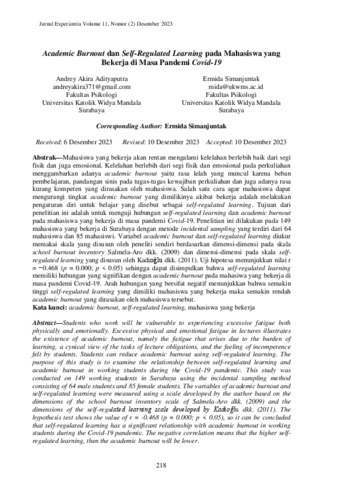 Adityaputra, Andrey Akira and Simanjuntak, Ermida (2023) Academic Burnout dan Self-Regulated Learning pada Mahasiswa yang Bekerja di Masa Pandemi Covid-19. Experientia: Jurnal Psikologi Indonesia, 11 (2). pp. 218-231. ISSN p-ISSN: 2252-7702, e-ISSN: 2685-9963