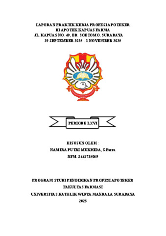 Mukhida, Namira Putri (2025) Laporan praktik kerja profesi apoteker di Apotek Kapuas Farma Jl. Kapuas No. 49, Dr. Soetomo, Surabaya 29 September 2025 - 1 November 2025. Project Report (PKL, PKIPP, Magang D3, Praktik Kerja Profesi Apoteker, Profesi Guru, Profesi Ners dan Profesi Insiyur). Faculty of Pharmacy, Surabaya, Indonesia. (Submitted)