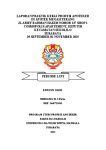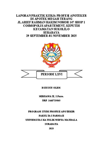 Mirnawati, Mirnawati (2025) Laporan Praktik Kerja Profesi Apoteker Di Apotek Megah Terang Jl.Arief Rahman Hakim Nomor 147 Shop 1 Cosmopolis Apartement, Keputih Kecamatan Sukolilo Surabaya 29 September-01 November 2025. Project Report (PKL, PKIPP, Magang D3, Praktik Kerja Profesi Apoteker, Profesi Guru, Profesi Ners dan Profesi Insiyur). Faculty of Pharmacy. (Submitted)