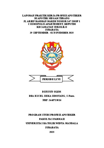 Sihotang, Dea Excel Siska (2025) Laporan Praktik Kerja Profesi Apoteker di Apotek Megah Terang Jl.Arief Rahman Hakim Nomor 147 Shop 1 Cosmopolis Apartement, Keputih Kecamatan Sukolilo Surabaya 29 September - 01 November 2025. Project Report (PKL, PKIPP, Magang D3, Praktik Kerja Profesi Apoteker, Profesi Guru, Profesi Ners dan Profesi Insiyur). Faculty of Pharmacy. (Submitted)