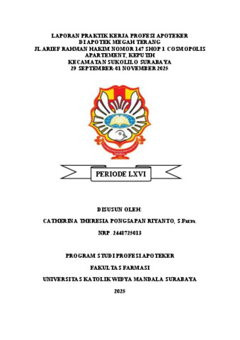 Riyanto, Catherina Theresia Pongsapan (2026) Laporan Praktik Kerja Profesi Apoteker di Apotek Megah Terang Jl. Arief Rahman Hakim Nomor 147 Shop 1 Cosmopolis Apartement, Keputih Kecamatan Sukolilo Surabaya 29 September - 01 November 2025. Project Report (PKL, PKIPP, Magang D3, Praktik Kerja Profesi Apoteker, Profesi Guru, Profesi Ners dan Profesi Insiyur). Faculty of Pharmacy, Surabaya, Indonesia. (Submitted)
