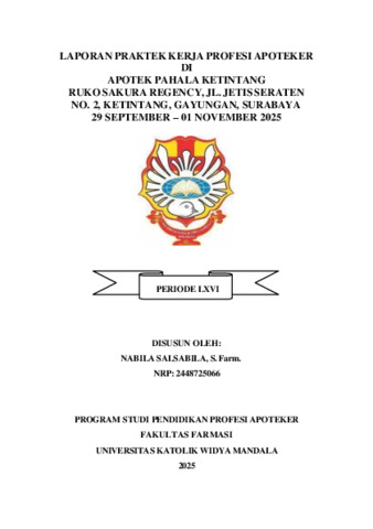 Salsabila, Nabila (2026) Laporan praktek kerja profesi Apoteker di Apotek Pahala Ketintang ruko Sakura Regency, Jl. Jetis Seraten no.2, Ketintang, Gayungan, Surabaya (29 September - 1 November 2025). Project Report (PKL, PKIPP, Magang D3, Praktik Kerja Profesi Apoteker, Profesi Guru, Profesi Ners dan Profesi Insiyur). Nabila Salabila. (Submitted)