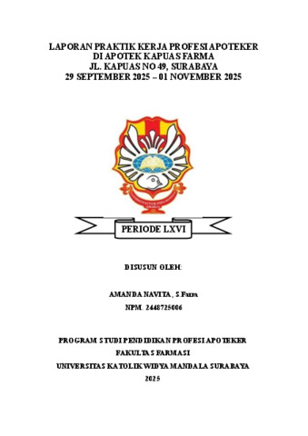 Navita, Amanda (2026) Laporan praktik kerja Profesi Apoteker di Apotek Kapuas Farma Jl. Kapuas no 49, Surabaya 29 September 2025 – 01 November 2025. Project Report (PKL, PKIPP, Magang D3, Praktik Kerja Profesi Apoteker, Profesi Guru, Profesi Ners dan Profesi Insiyur). Faculty of Pharmacy. (Submitted)