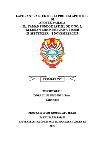 Ningsih, Indri Gusti (2026) Laporan praktek kerja Profesi Apoteker di Apotek Pahala Jl. Taman Pondok Jati Blok C no. 2, Geluran, Sidoarjo, Jawa Timur 29 September - 1 November 2025. Project Report (PKL, PKIPP, Magang D3, Praktik Kerja Profesi Apoteker, Profesi Guru, Profesi Ners dan Profesi Insiyur). Widya Mandala Surabaya Catholic University, Surabaya. (Submitted)
