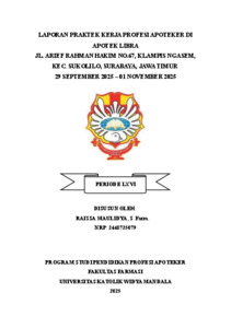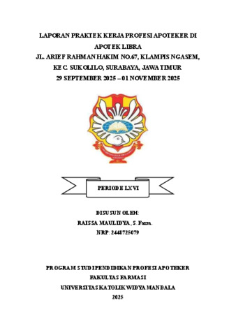 Maulidya, Raissa (2026) Laporan praktek kerja profesi Apoteker di Apotek Libra. Project Report (PKL, PKIPP, Magang D3, Praktik Kerja Profesi Apoteker, Profesi Guru, Profesi Ners dan Profesi Insiyur). Faculty of Pharmacy, Surabaya. (Unpublished)