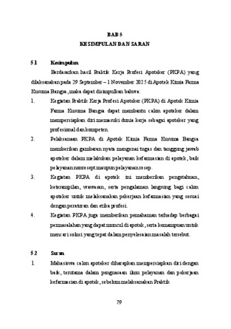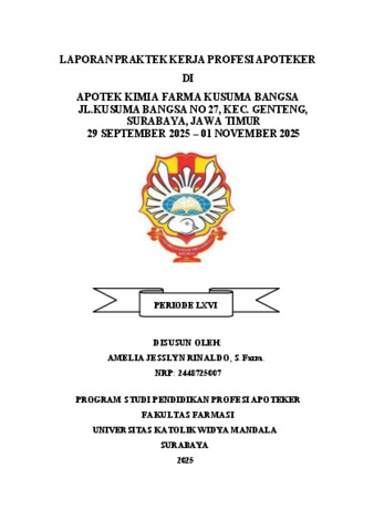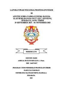 Rinaldo, Amelia Jesslyn (2026) Laporan praktek kerja profesi Apoteker di Apotek Kimia Farma Kusuma Bangsa Jl.Kusuma Bangsa no 27, Kec. Genteng, Surabaya, Jawa Timur 29 September 2025 – 01 November 2025. Project Report (PKL, PKIPP, Magang D3, Praktik Kerja Profesi Apoteker, Profesi Guru, Profesi Ners dan Profesi Insiyur). Laporan PKPA Apotek. (Unpublished)