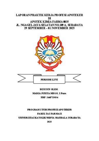 Mego, Maria Junita (2025) Laporan praktik kerja profesi apoteker di Apotek Kimia Farma 0035 Jl. Ngagel Jaya Selatan No. 109 A, Surabaya 29 September-01 November 2025. Project Report (PKL, PKIPP, Magang D3, Praktik Kerja Profesi Apoteker, Profesi Guru, Profesi Ners dan Profesi Insiyur). Faculty of Pharmacy, Surabaya. (Submitted)