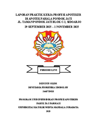 Simbolon, Devitaria Fiorenika (2026) Laporan Praktik Kerja Profesi Apoteker di Apotek Pahala Pondok Jati Jl. Taman Pondok Jati Blok C-2, Sidoarjo 29 September 2025 – 1 November 2025. Project Report (PKL, PKIPP, Magang D3, Praktik Kerja Profesi Apoteker, Profesi Guru, Profesi Ners dan Profesi Insiyur). Faculty of Pharmacy, Surabaya, Indonesia. (Submitted)