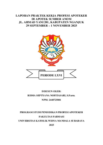 Nofitasari, Risma Septyana (2025) Laporan praktik kerja profesi apoteker di Apotek Sumber Anom Jl. Ahmad Yani 201, Kabupaten Nganjuk 29 September–01 November 2025. Project Report (PKL, PKIPP, Magang D3, Praktik Kerja Profesi Apoteker, Profesi Guru, Profesi Ners dan Profesi Insiyur). Faculty of Pharmacy, Surabaya. (Submitted)