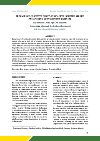 Kartikasari, Desy, Supit, Paulus and Kurniawati, Nita (2026) Prevalence Cognitive Function of Acute Ischemic Stroke Patients in Gotong Royong Hospital. Journal of Widya Medika Junior, 8 (1). pp. 39-43. ISSN 26561409