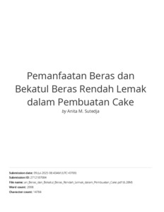 | Uncontrolled Keywords: | beras, bekatul beras rendah lemak,cake |