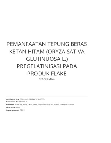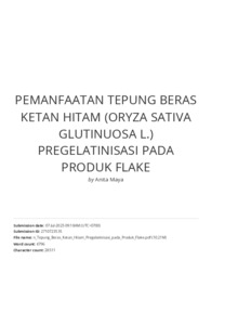 Penggunaan tepung beras ketan hitam dapat menimbulkan rasa berpati (starchy) pada flake karena pati yang belum tergelatinisasi selama proses pemasakan. Hal tersebut menyebabkan tepung beras ketan hitam yang digunakan tersebut perlu diberi perlakuan pendahuluan, yaitu pregelatinisasi. Pregelatinisasi dilakukan dengan cara mengukus tepung beras ketan hitam lalu diaplikasikan dalam flake. Flake ketan hitam dengan pregelatinisasi 45 menit memiliki tingkat kerenyahan yang rendah akibat adanya serat sehingga diperlukan substitusi dengan tapioka. Proporsi tepung beras ketan pregelatinisasi dan tapioka yang tepat untuk menghasilkan flake beras ketan hitam adalah proporsi 60% tepung beras ketan hitam pregelatinisasi dan 40% tapioka. Flake ini memiliki kadar air 3,51%, daya patah 410,47g, serta daya rehidrasi sebesar 77,36%, namun masih memiliki sedikit rasa berpati. Hal ini menyebabkan diperlukannya penentuan waktu pregelatinisasi untuk memperoleh tingkat gelatinisasi yang tepat. Pregelatinisasi dengan pengukusan selama 60 menit memberikan flake dengan karakteristik terbaik, yaitu memiliki kadar air 2,87%, daya patah 314,53g, serta daya rehidrasi sebesar 81,50% serta tingkat kesukaan kerenyahan 5,84 (agak suka-suka) dan rasa tidak berpati 5,19 (agak tidak terasa).